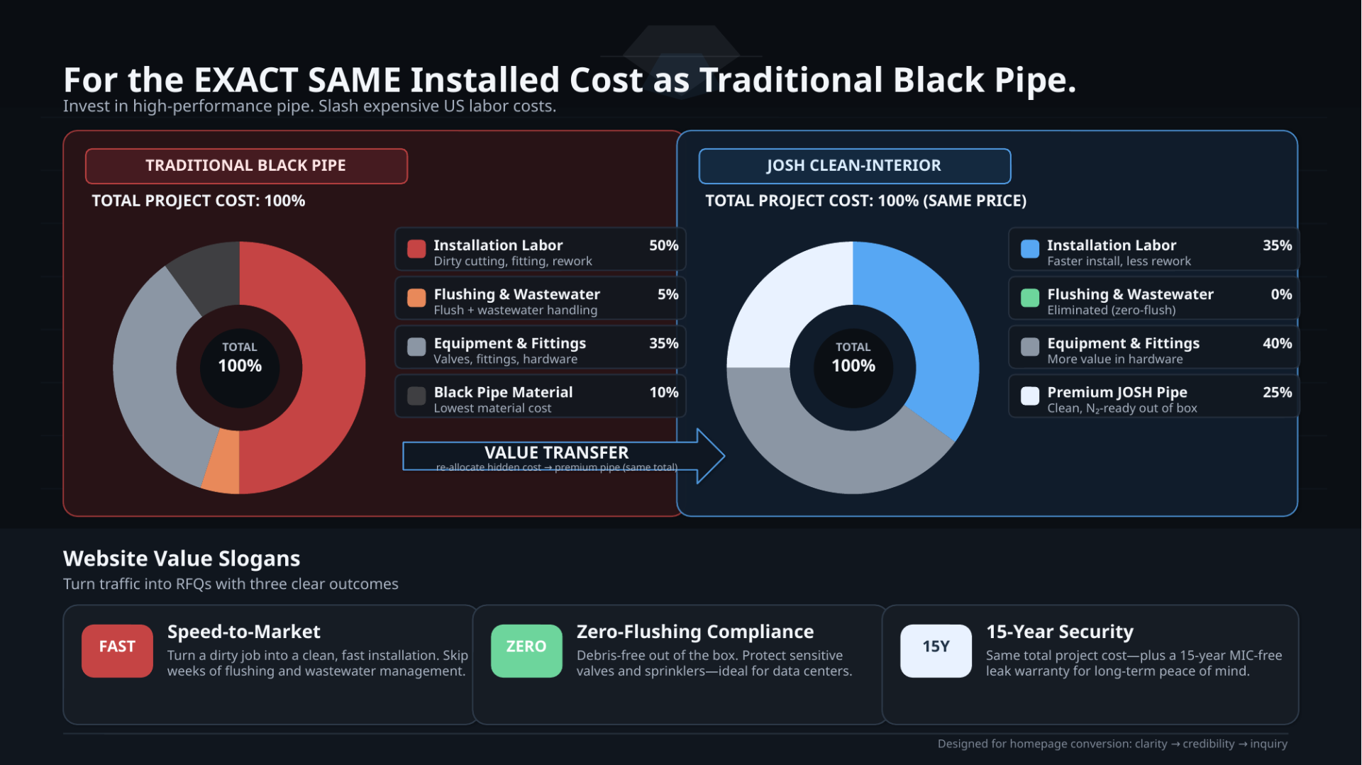 Lower 15-Year Lifecycle Cost → Stronger Value Story: Owners get lower leak risk, fewer shutdowns, and lower long-term repair/replacement cost.